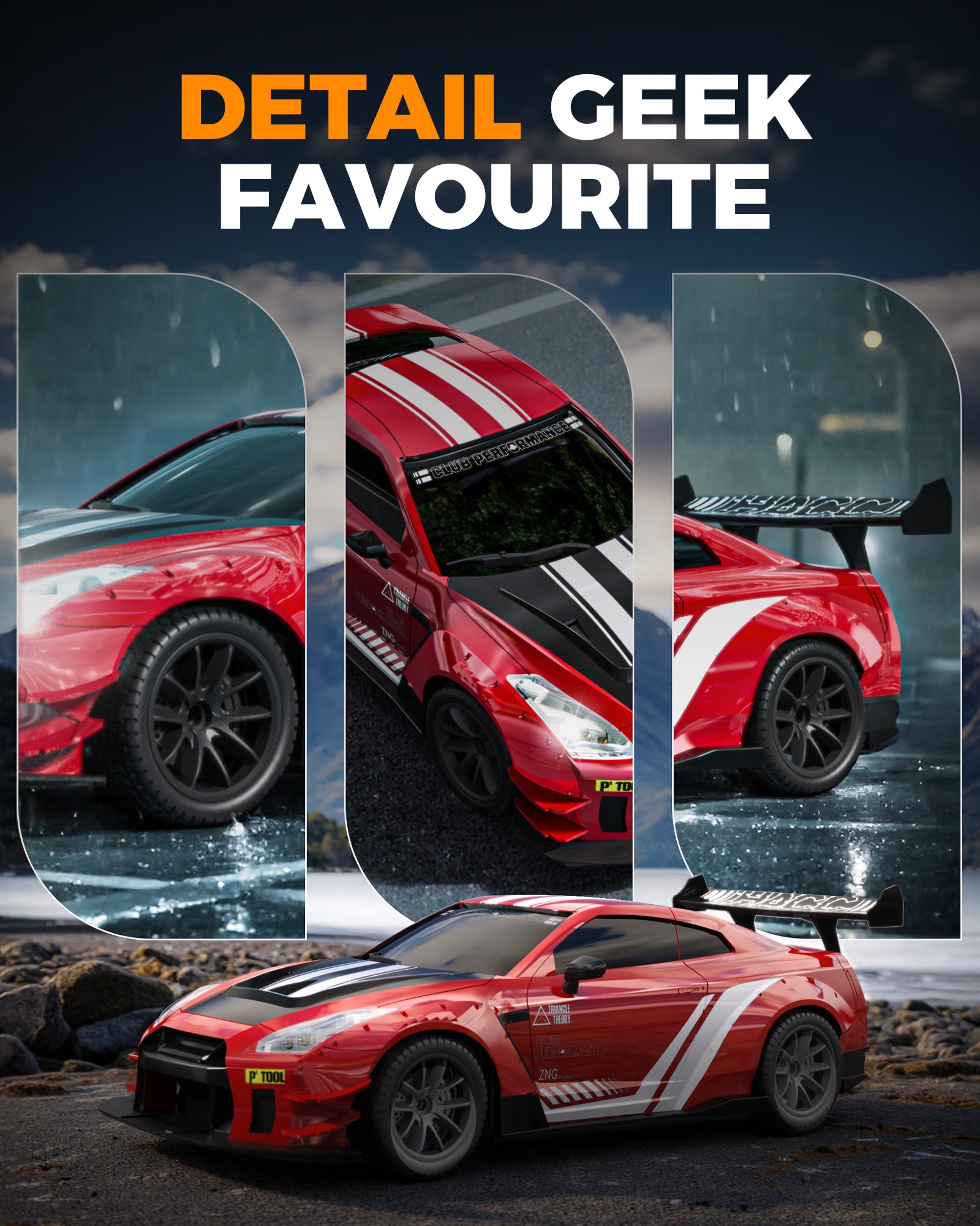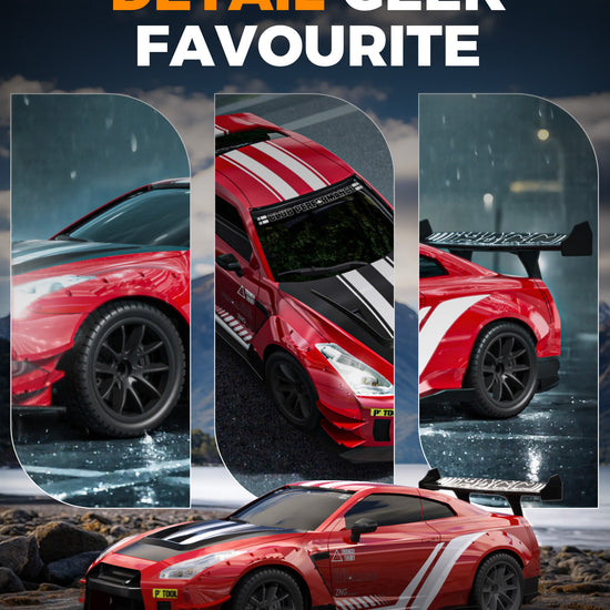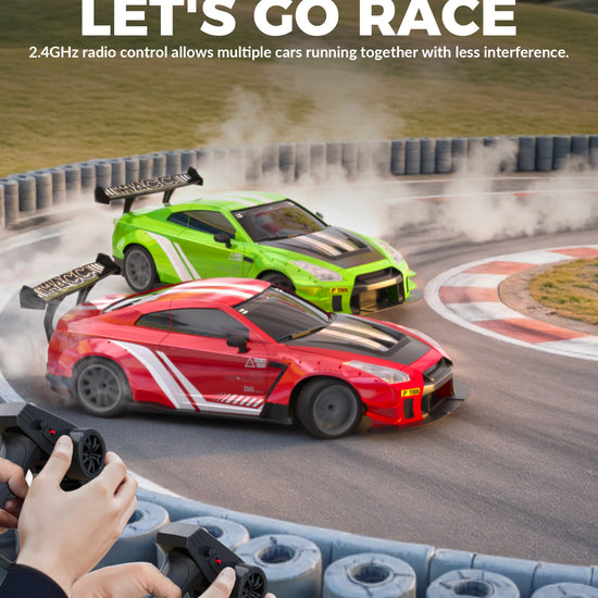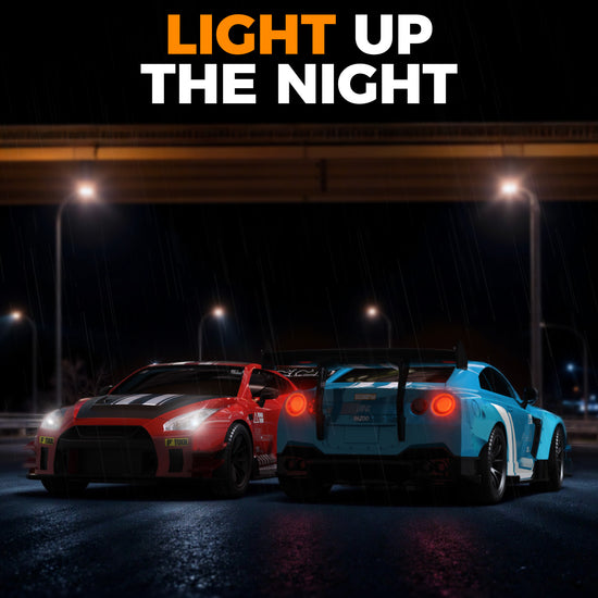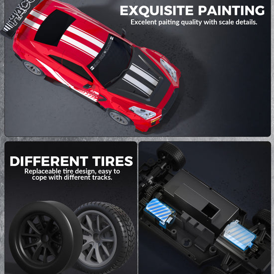 The car has a tough shell to handle bumps and thick tires that last long. You can race fast or drift, sliding sideways like in movies, with replaceable tires for racing or drifting. It has bright LED lights that flash when powered on, and a cool mist effect from the back when you press a button on the remote, making it look awesome, especially at night. -