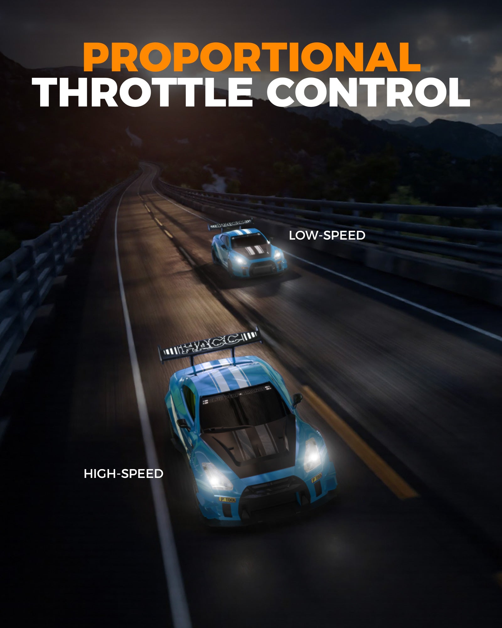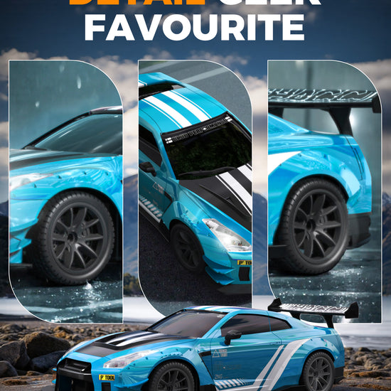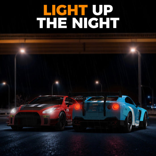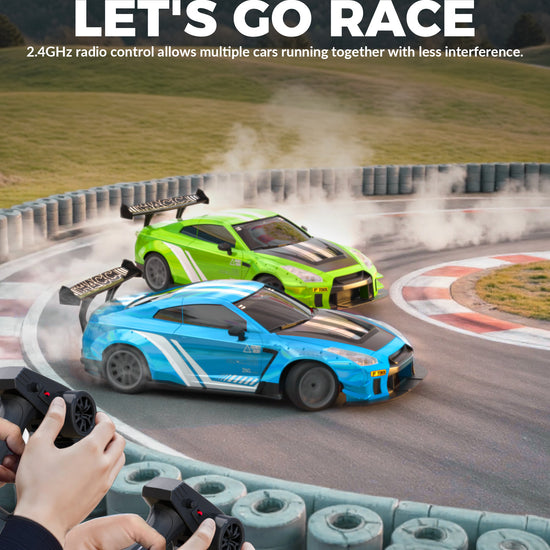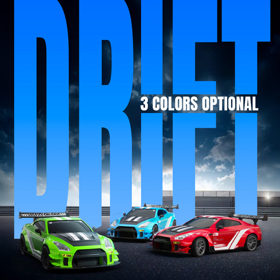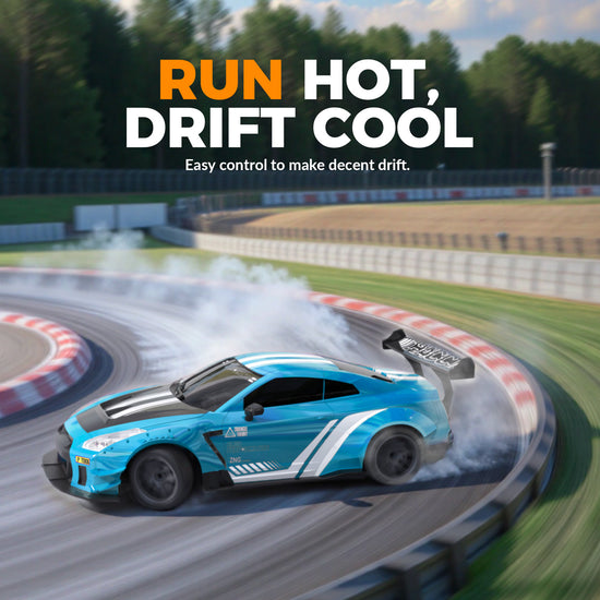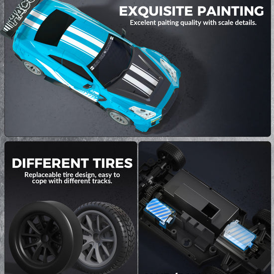 The car has a tough shell to handle bumps and thick tires that last long. You can race fast or drift, sliding sideways like in movies, with replaceable tires for racing or drifting. It has bright LED lights that flash when powered on, and a cool mist effect from the back when you press a button on the remote, making it look awesome, especially at night. -